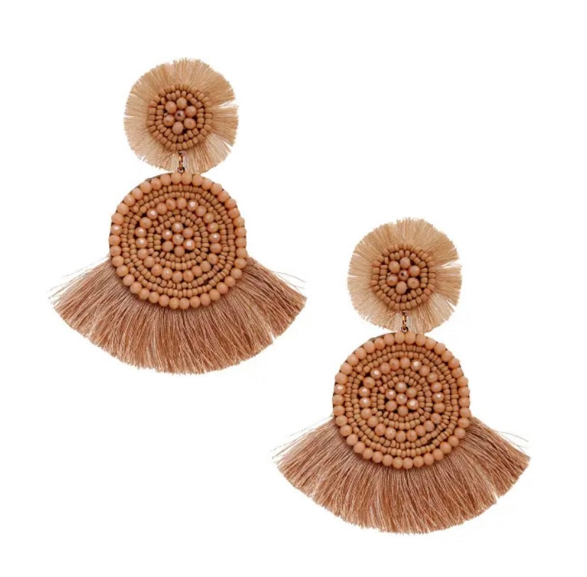 Seed Bead Double Circle Drop Earrings Featuring Silk Fan Tassel Detailing. Felt Backing. Earrings measure 3.25 inches wide Available in blue and natural