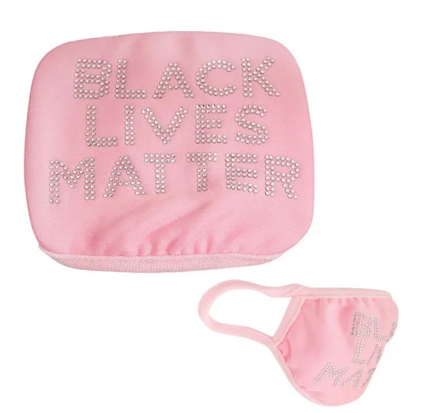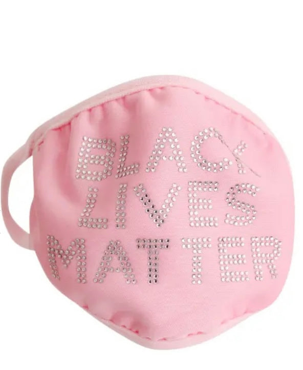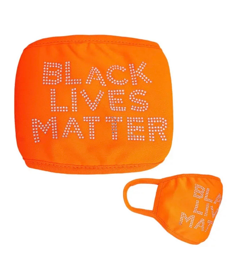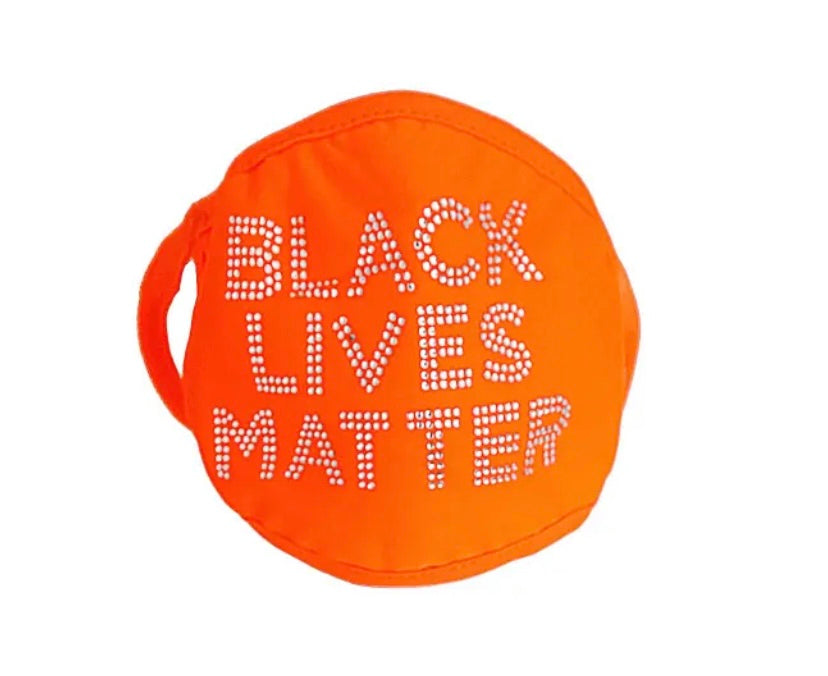 Soft Neon Orange and Pink Stretch Cotton Face Mask Featuring Clear Rhinestone BLACK LIVES MATTER Detailing. Stretch Earbands. Woven White Cotton Interior. Reusable. Washable.
