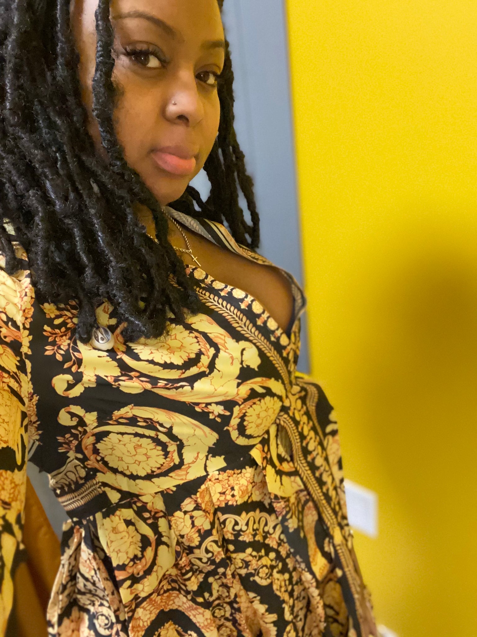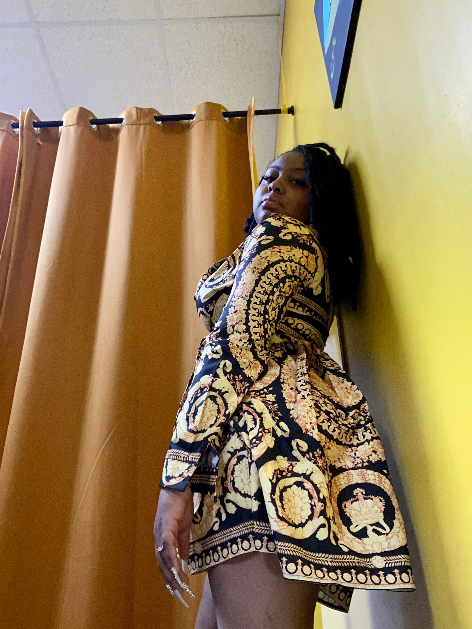 Medallion/Flower print partial button up luxury shirt-dress, polyester/spandex blend, knitted