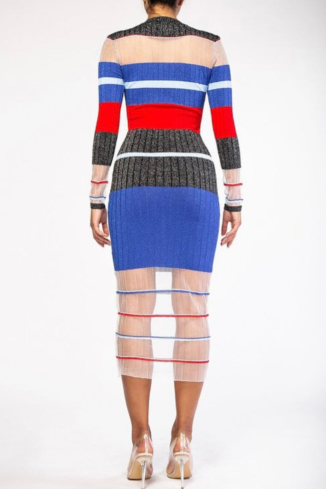 Mesh and Lurex Colorblocked Maxi Bodycon Dress, round neck, ribbed hem, form fitting silhouette, Maxi length bodice