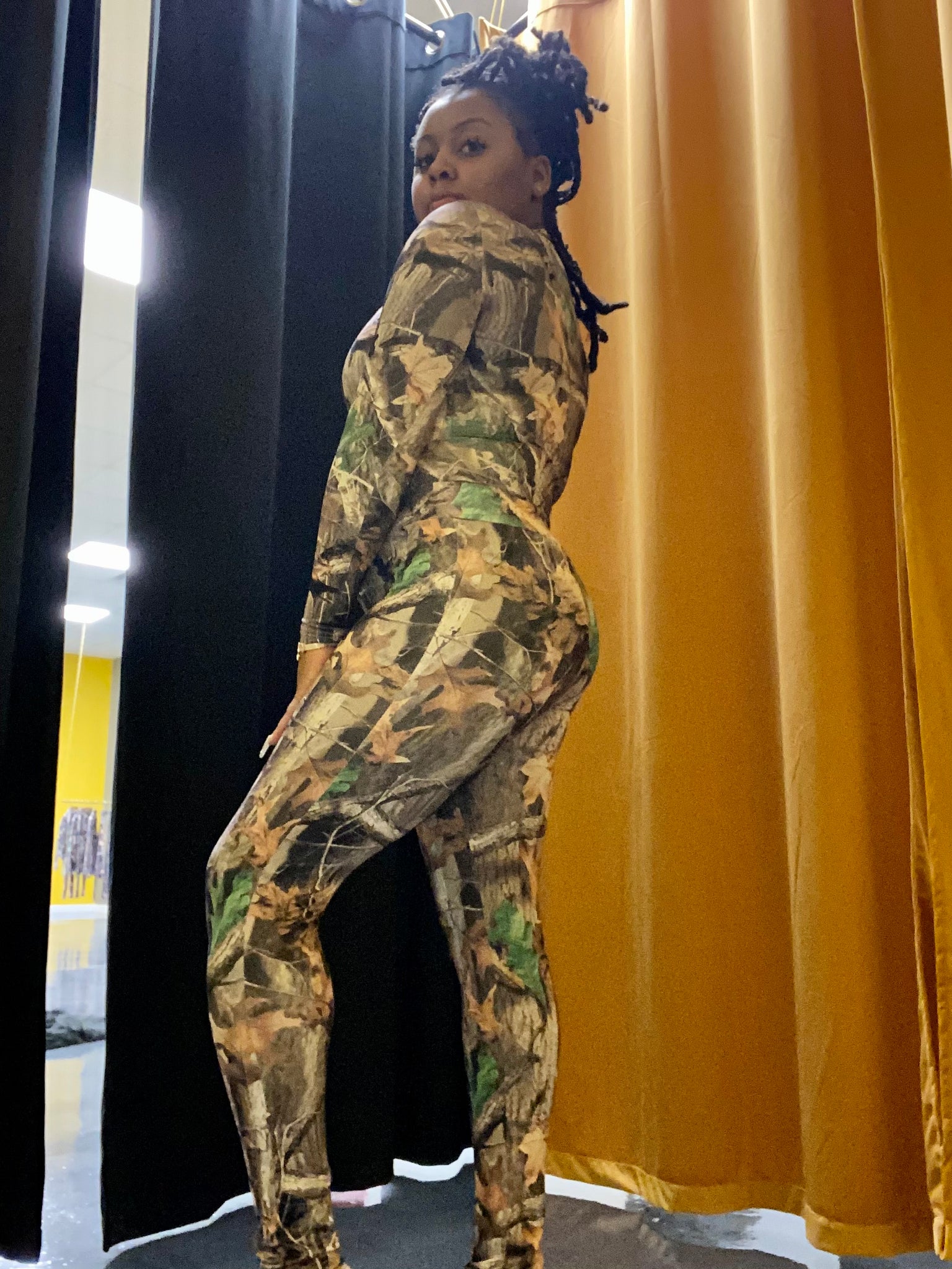 Two piece, body suit and tight set, leaf/camo print, as seen on, spandex,polyester