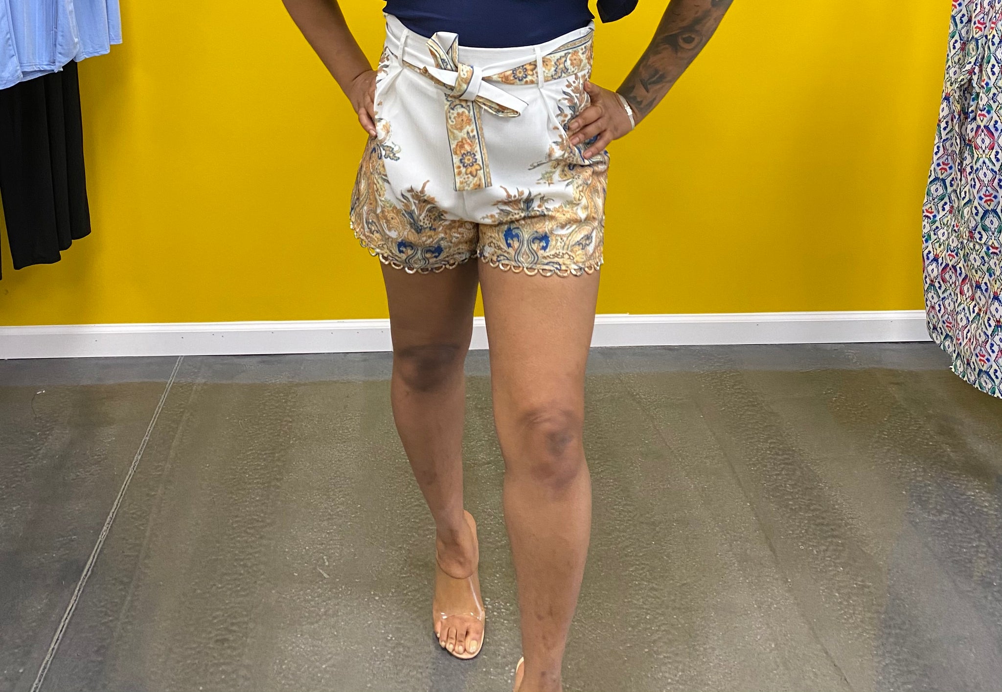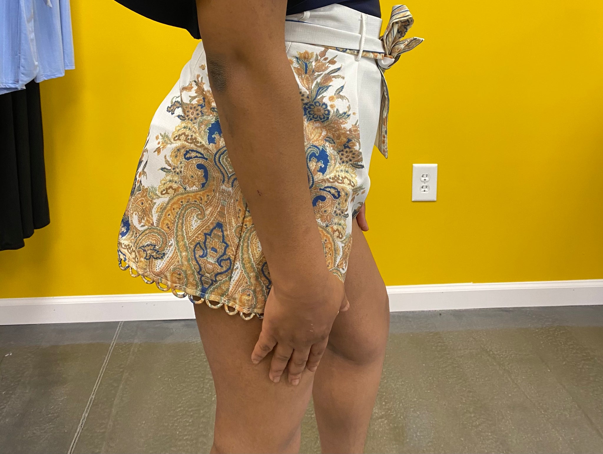 White, Floral design print short with drapery detail and belt