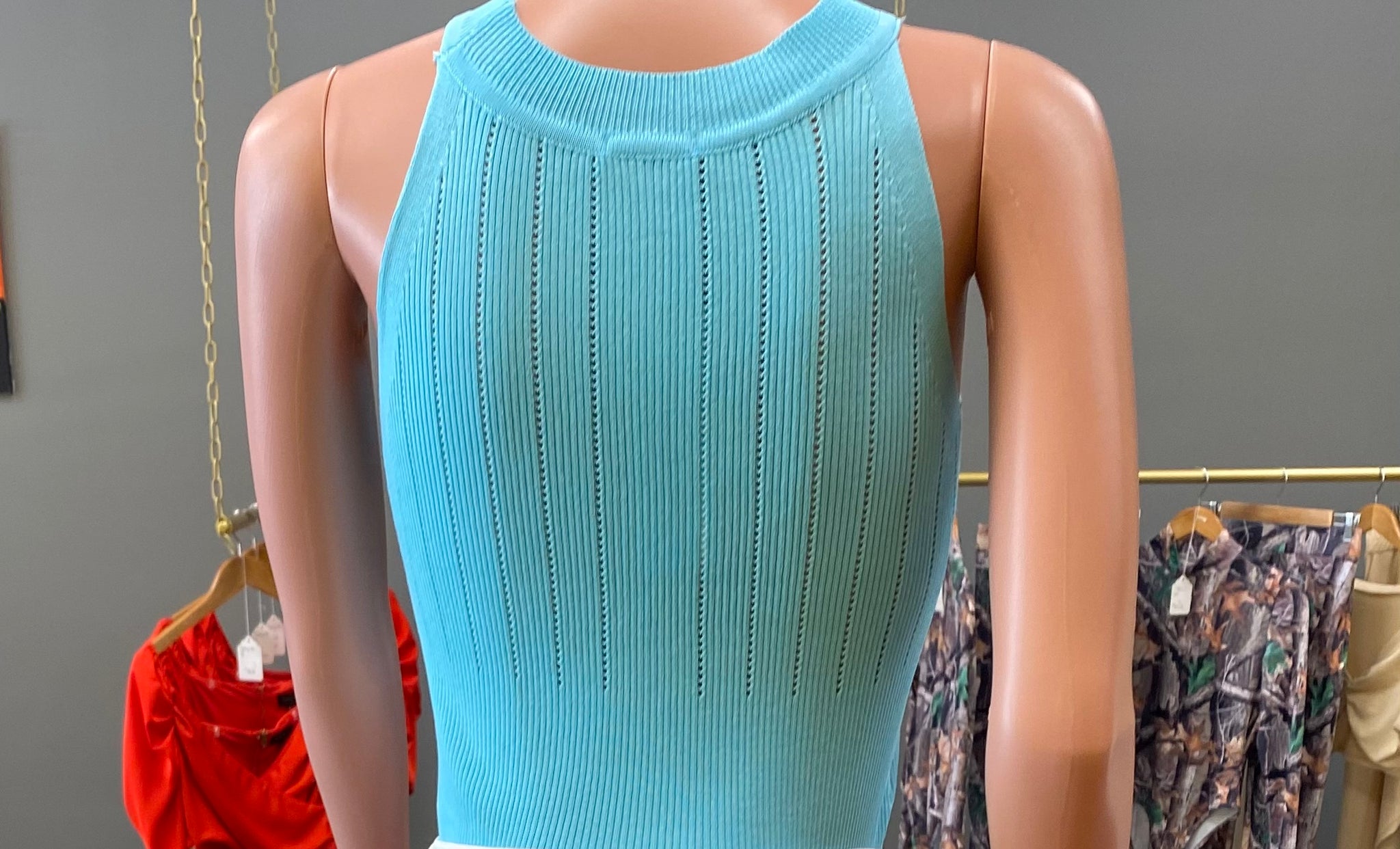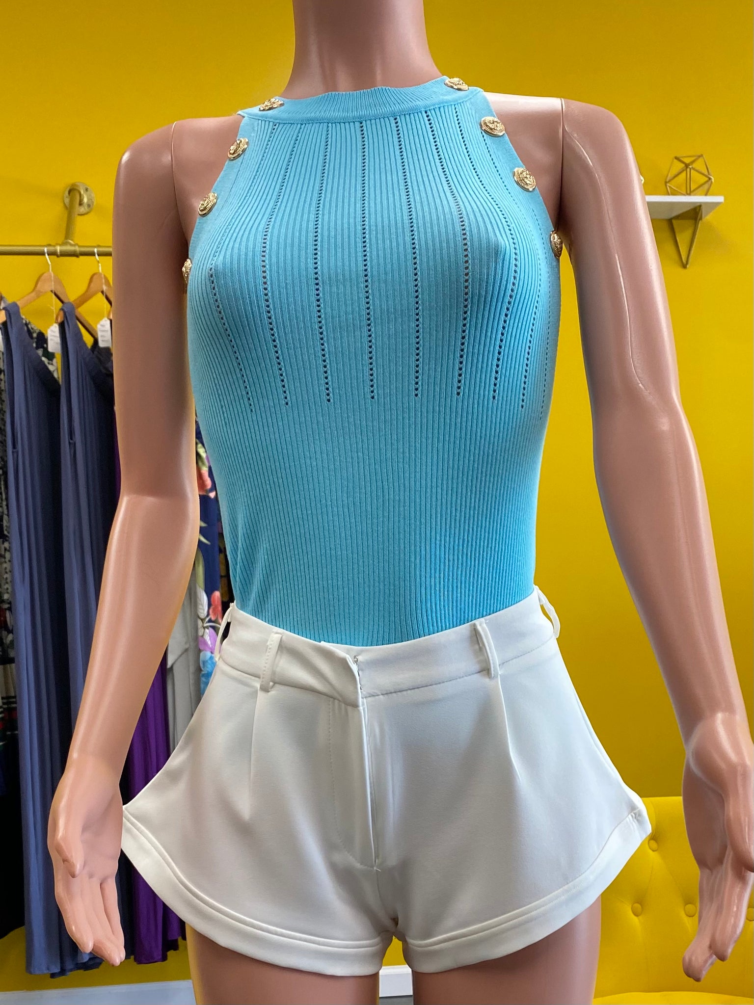 Blue Sleeveless knitted slim top, gold button embellished. 80% Viscose 20% Spandex