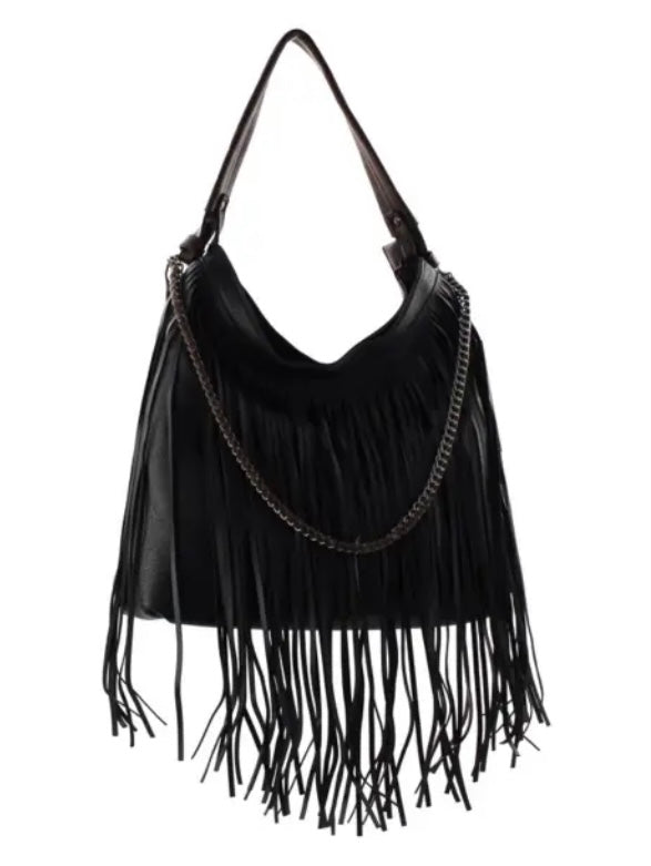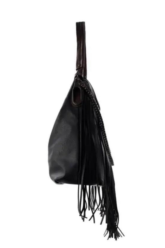 Black Vegan Leather Hobo Handbag Featuring Fringe and Double Shoulder Strap Detail. Bag has Both Leather and Chain Shoulder Strap. Main Zipper Closure. Divided Interior with Zipper Pocket. Rear Zipper Pocket