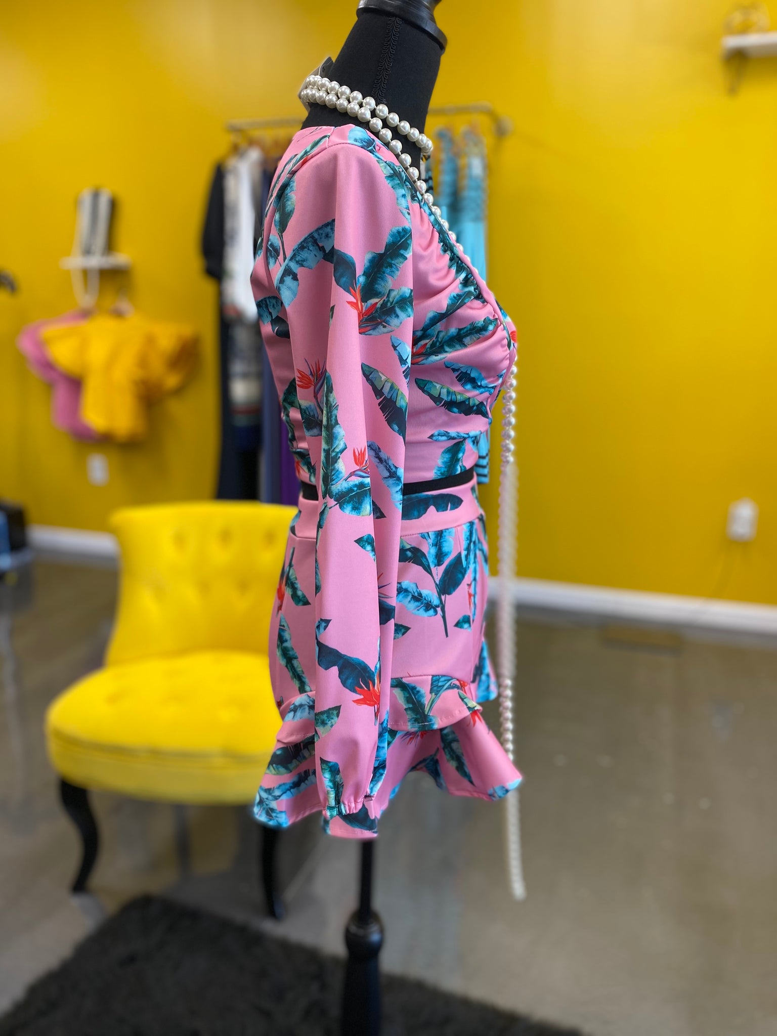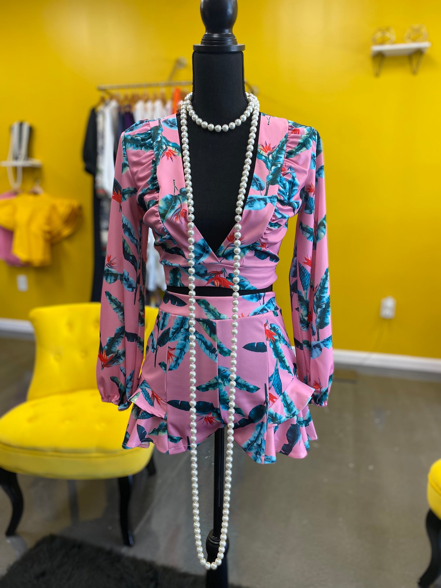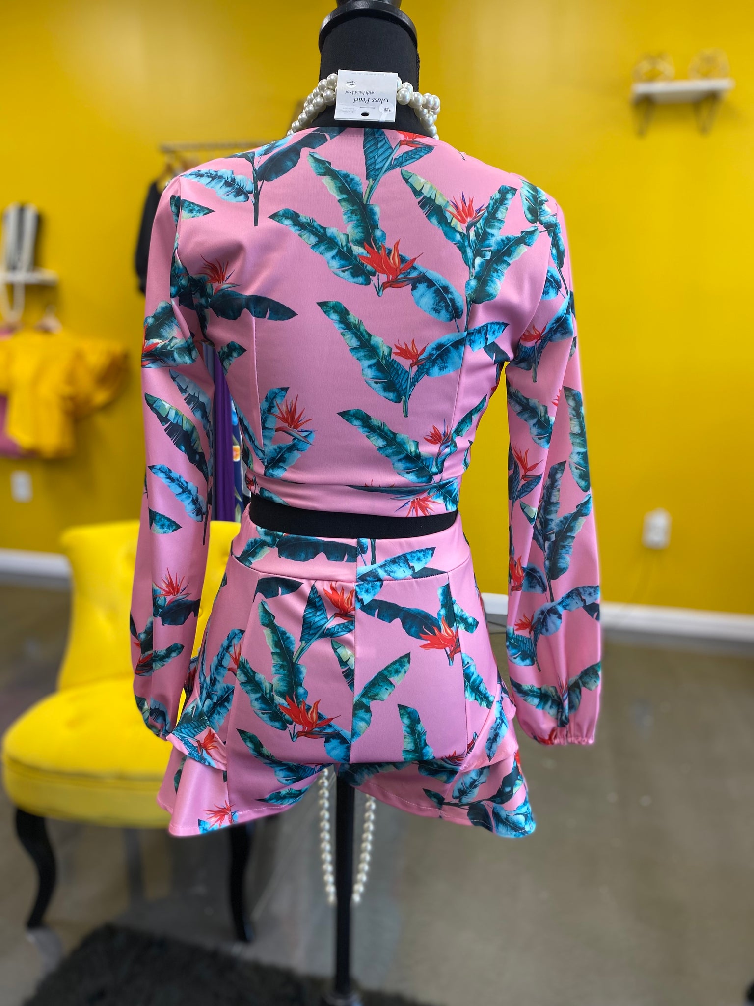 Two-piece floral printed set that consists of a deep neckline cropped top paired with a skort made from high-quality cotton and polyester