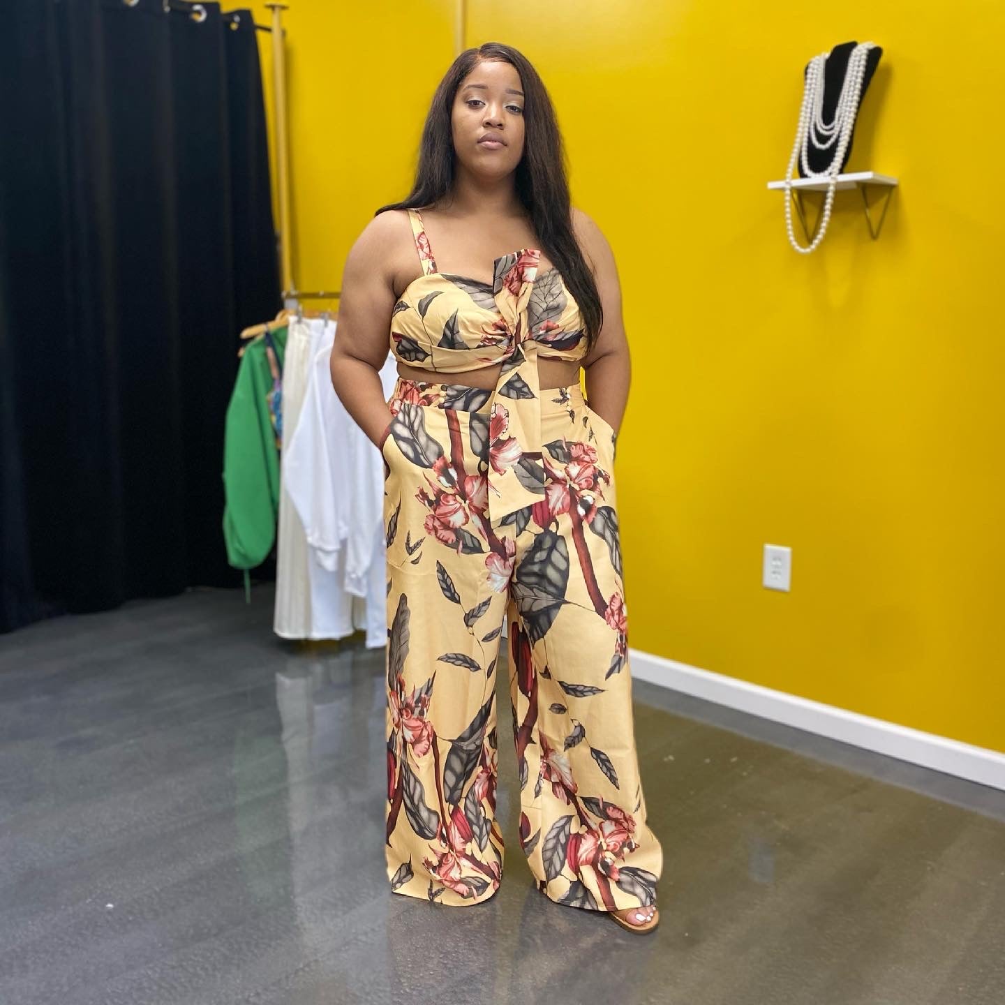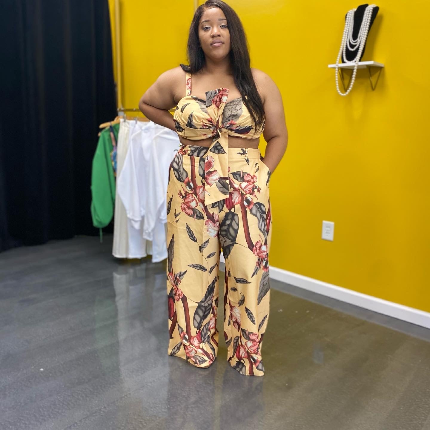 Yellow Floral Print 2pc set features a Twisted Crop Top that has wide tank straps, a triangle bodice, and trendy twist-front detail. Wide Leg Pants have a high-rise fit.