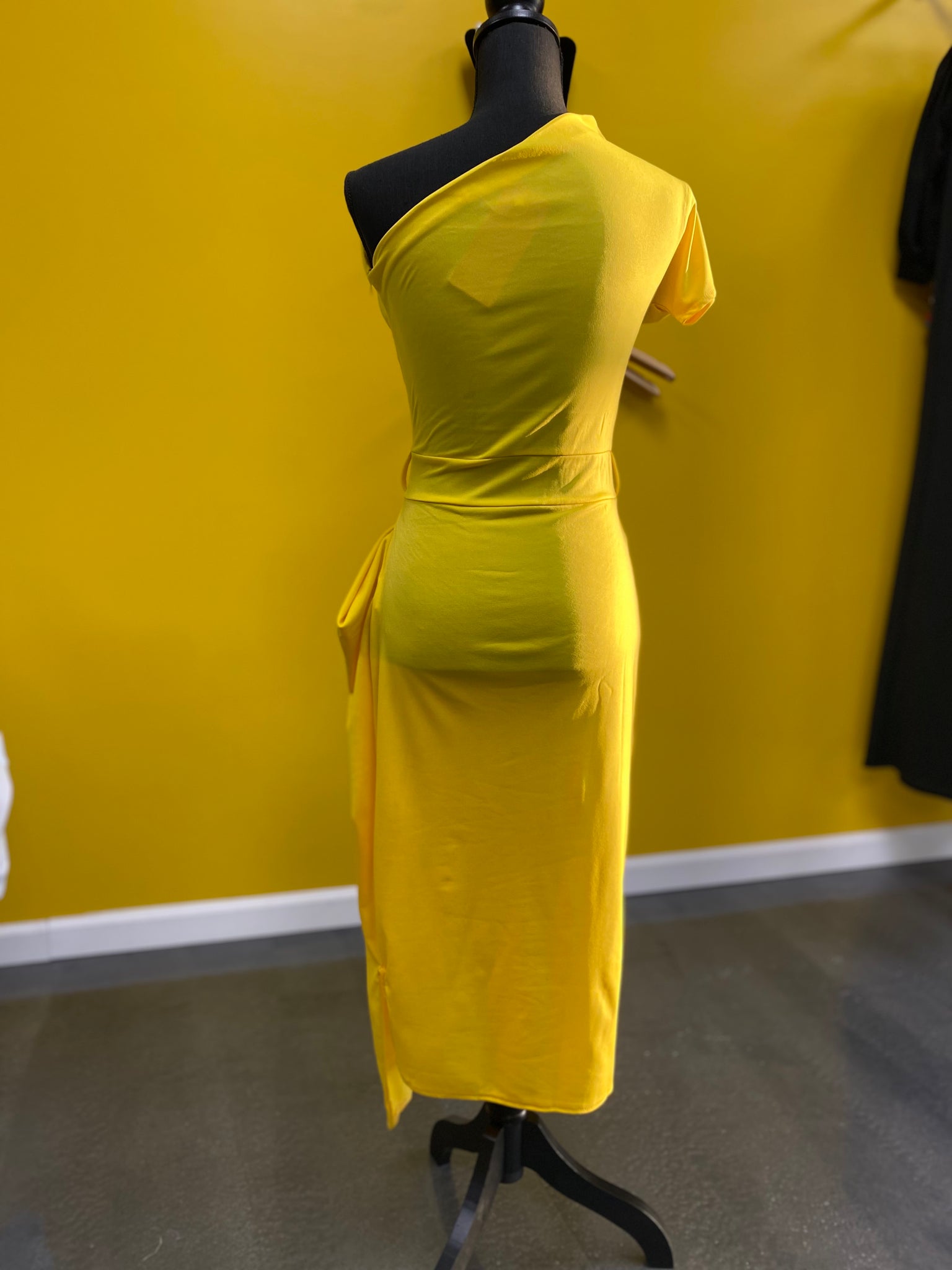 Trendy Frill Neck Belted Ruched Women Elegant Fitted Classic Pleated One Shoulder Casual Maxi Dresses- SOLID YELLOW